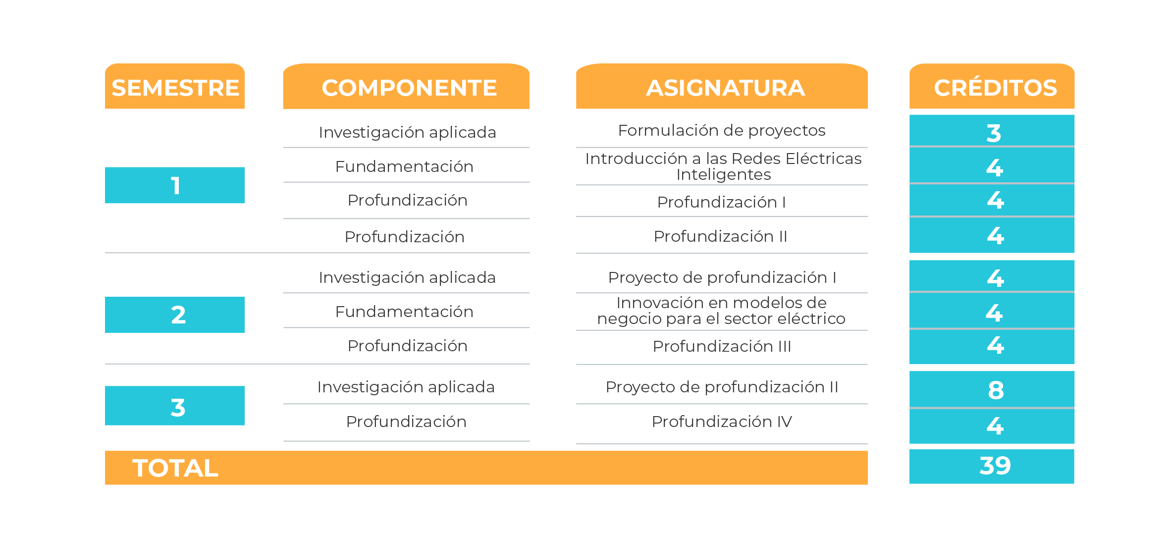 La estructura curricular del programa académico de Maestría en transformación digital de las redes eléctricas estará organizada por las siguientes áreas o componentes: